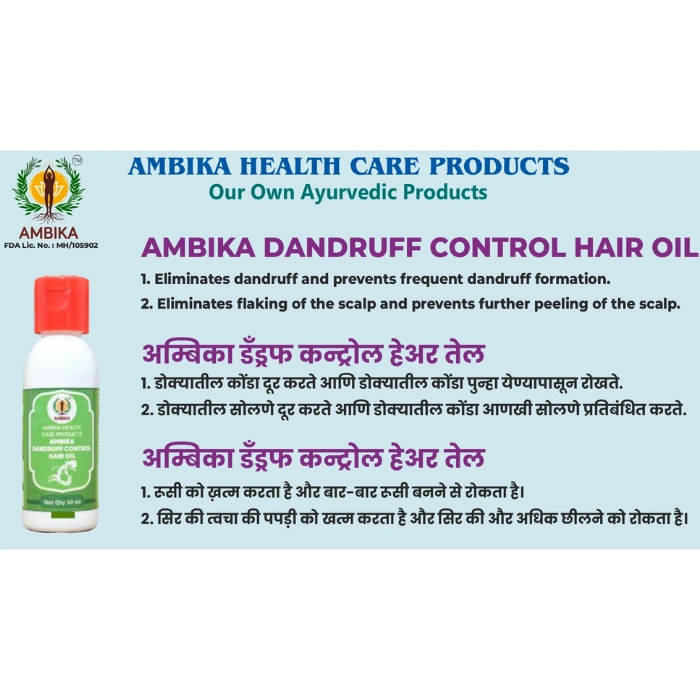 Ambika Dandruff Control Oil is a 50 ml Ayurvedic formulation designed to combat dandruff and nourish the scalp holistically. Composed of traditional herbs and natural oils, this blend targets fungal and bacterial scalp irritation, controls flakiness, and reduces itching. Ideal for regular use, it leaves your scalp feeling clean, calm, and refreshed, while also supporting healthy hair growth.