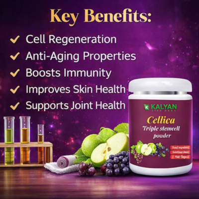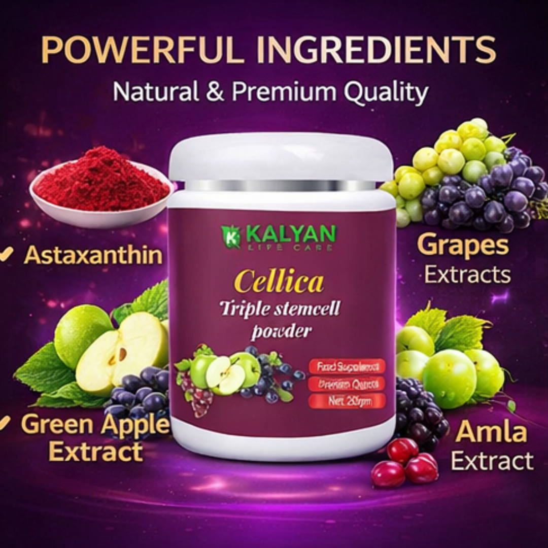 Kalyan Life Care Cellica Triple Stemcell Powder is a powerful nutritional supplement formulated with premium natural extracts including Green Apple, Grapes, Amla, and Astaxanthin. It supports overall wellness and rejuvenation from within.